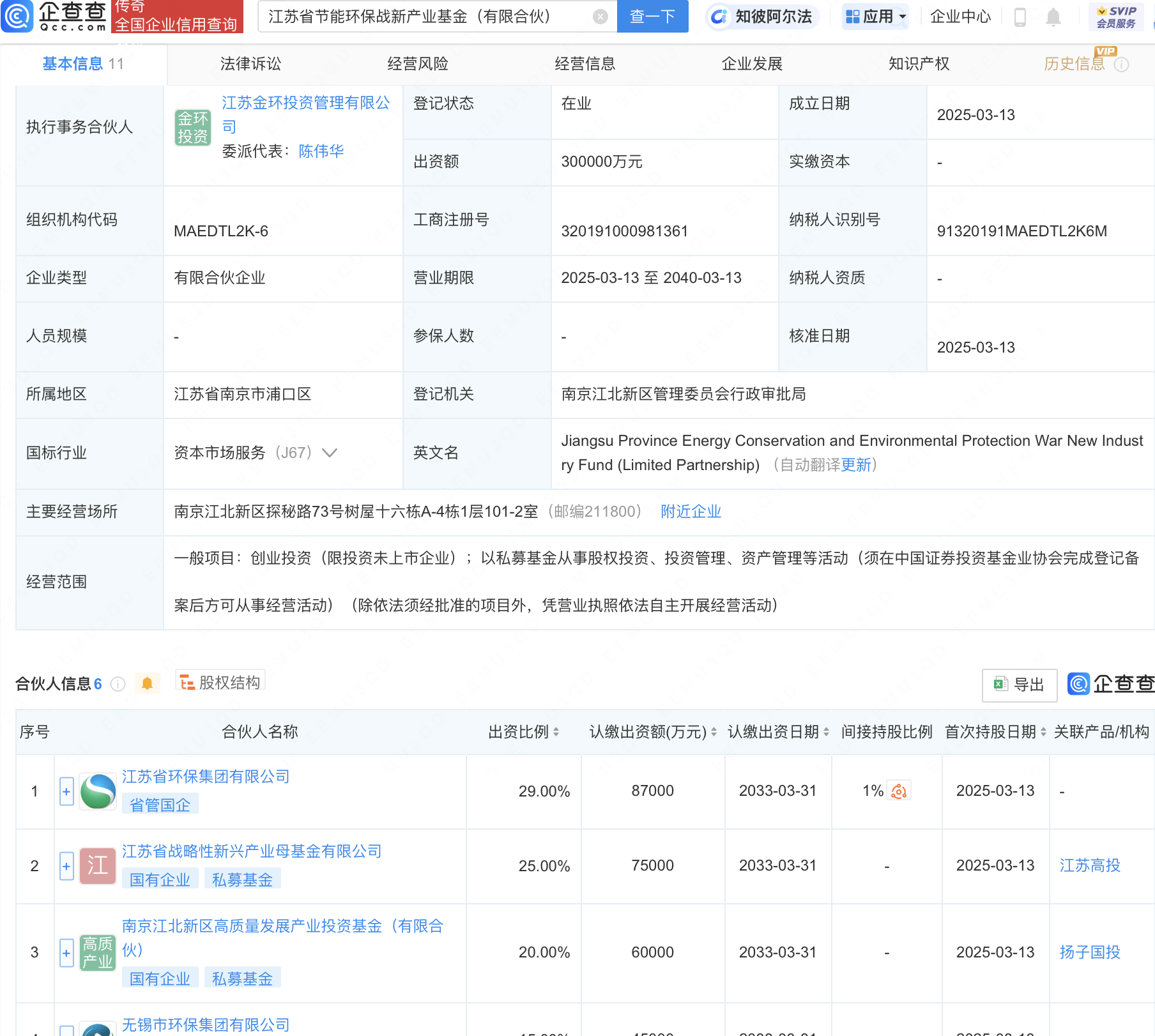 企查查股权穿透显示,该企业由江苏省环保集团有限公司、江苏省战略性新兴产业母基金有限公司等共同出资。